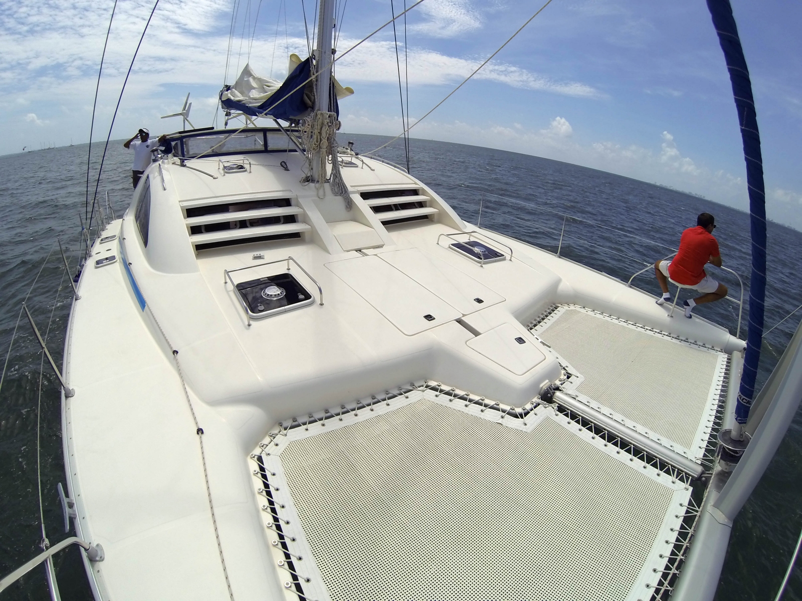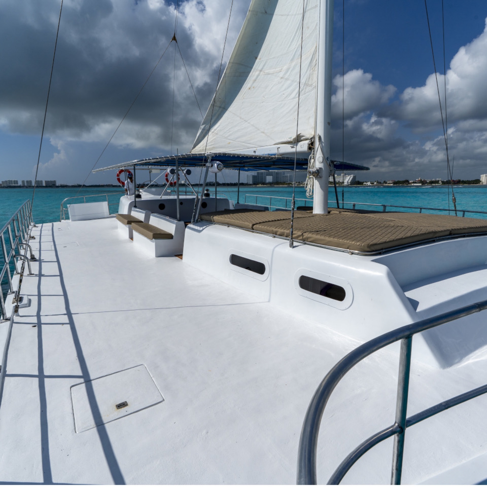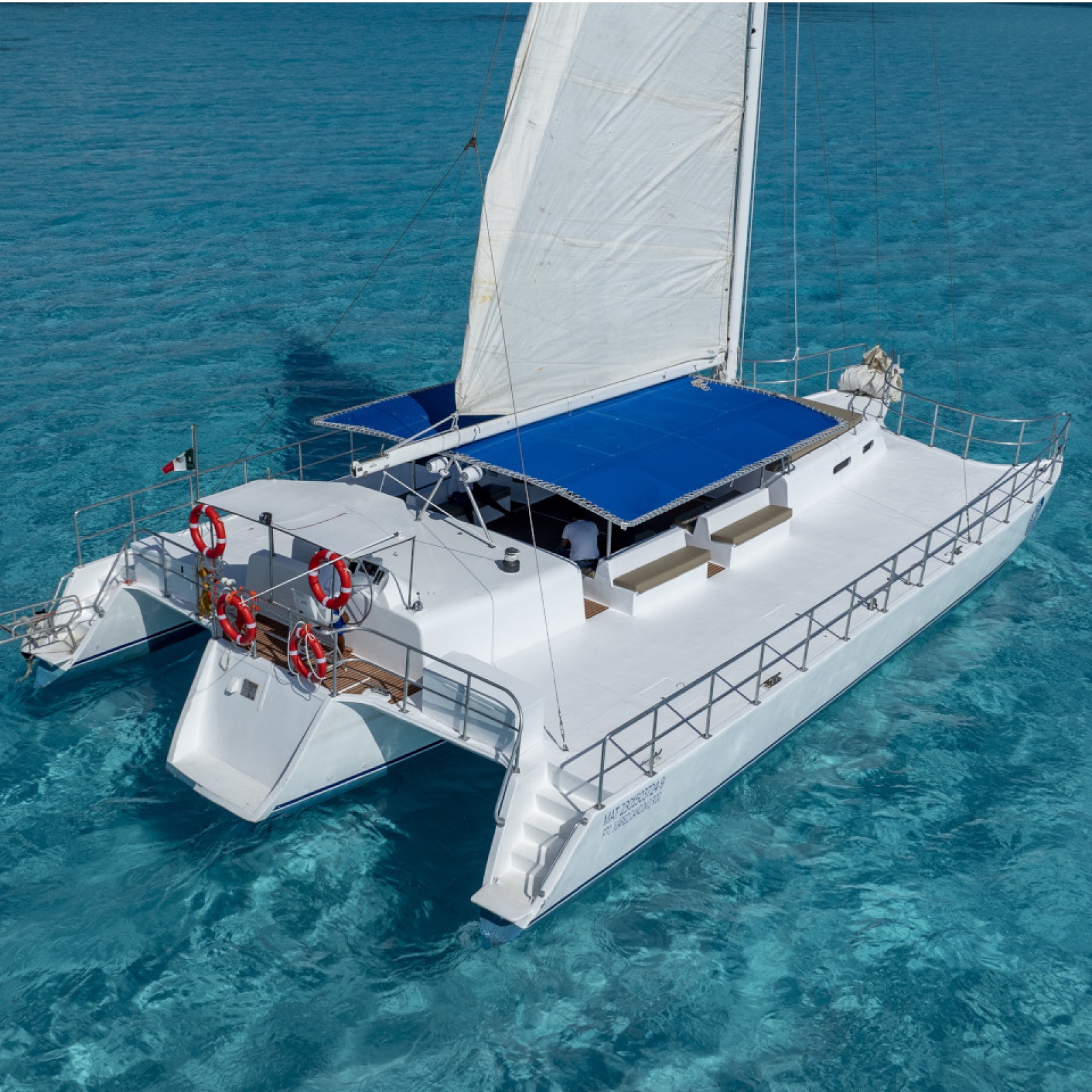 Enjoy a day sailing through the Caribbean Sea aboard our 46 ft Crew Cat Catamaran, you can choose a trip to Isla Mujeres or just sailing on the bay. Snorkel and discover the natural beauty of the great reefs and the multi color fish.